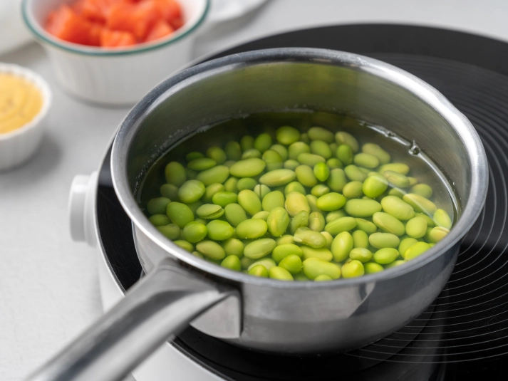 Налейте воду в небольшой сотейник и поставьте его на средний огонь. Добавьте бобы эдамаме, посолите и варите 5–10 минут, в зависимости от того, насколько упругими вы хотите их получить. Затем снимите сотейник с огня и слейте воду. -