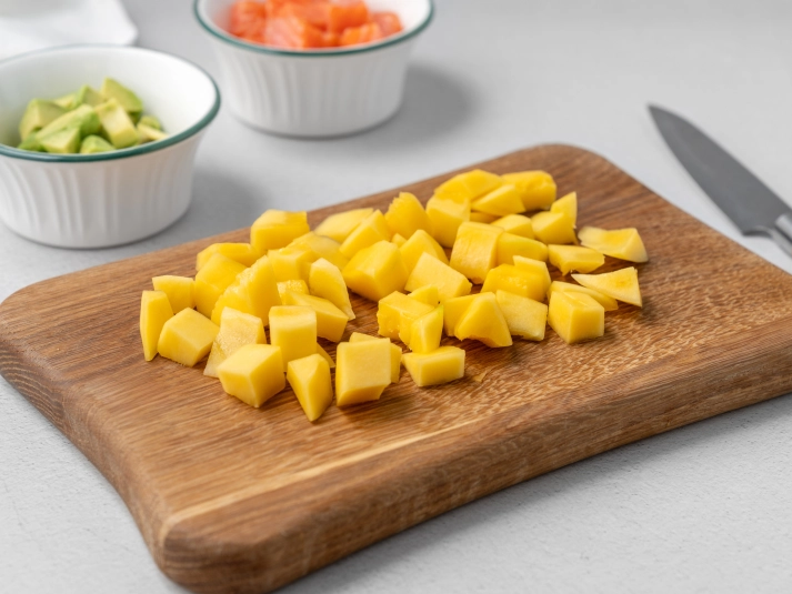 Разрежьте авокадо пополам и удалите косточку. Отделите мякоть от кожуры с помощью столовой ложки. На половинке манго сделайте диагональные надрезы в одну сторону и в другую. Достаньте мякоть с помощью ложки или ножа. Нарежьте авокадо и манго кубиками размером 1–2 см. -