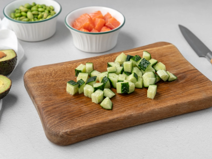 Нарежьте огурец кружочками или кубиками. -
