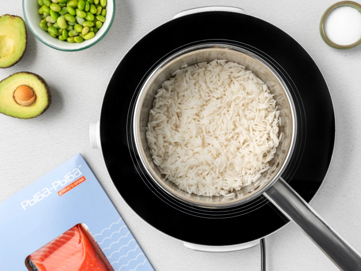 В кастрюле с толстым дном доведите до кипения 200 мл воды и всыпьте рис. Варите на среднем огне 10–20 минут в зависимости от инструкции на упаковке. Затем снимите кастрюлю с огня и промойте готовый рис в холодной воде. -