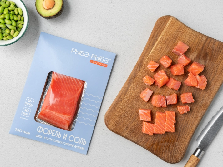 Отделите форель от кожи с помощью острого ножа. Нарежьте рыбу кубиками размером 1–2 см. -